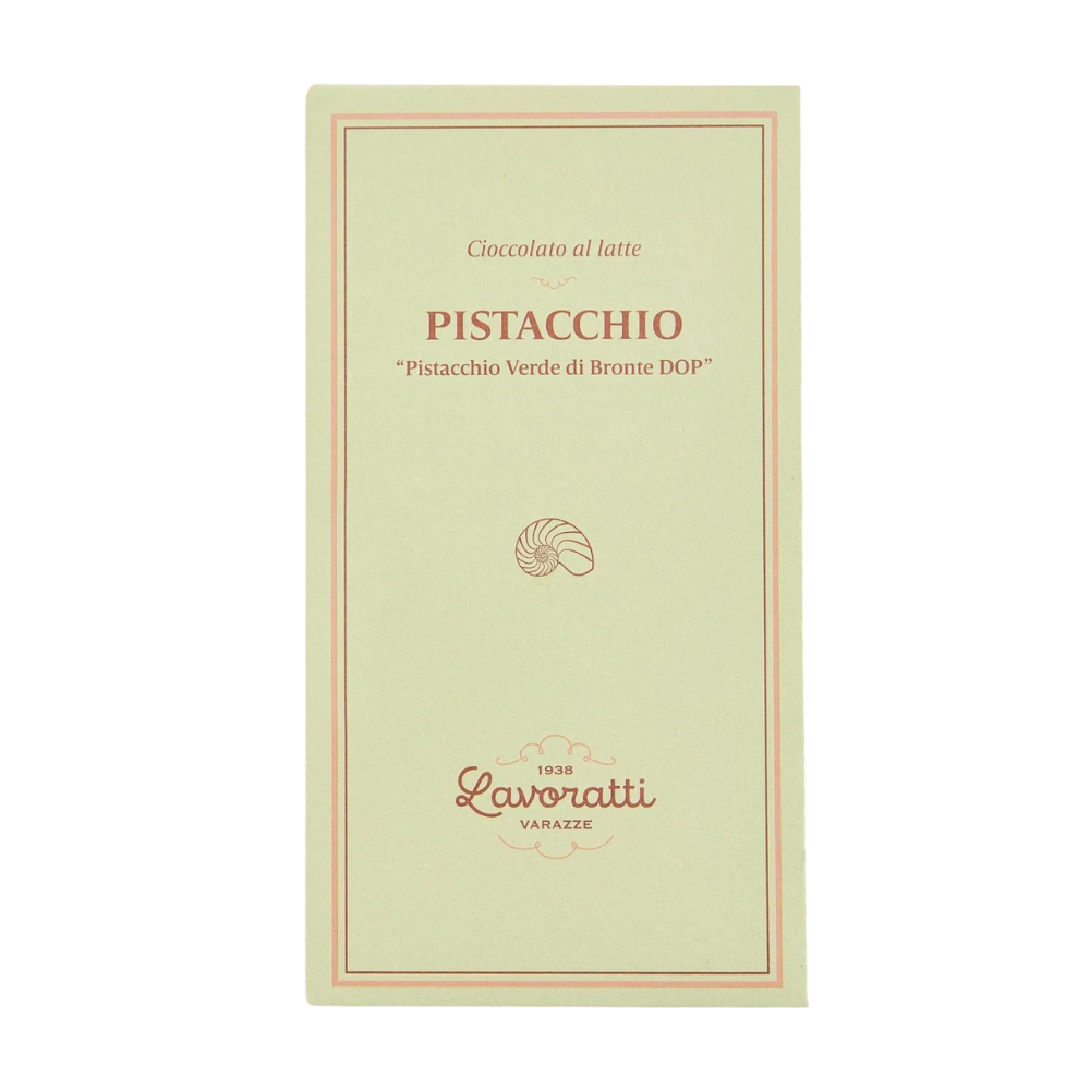 LAVORATTI Tavoletta di Cioccolato al Latte con Pistacchio Verde di Bronte DOP: Cacao 36%, zucchero, burro di cacao, pasta di cacao, latte intero in polvere, pasta di Pistacchio Verde di Bronte DOP(14,4%), emulsionante (lecitina di soia non OGM).