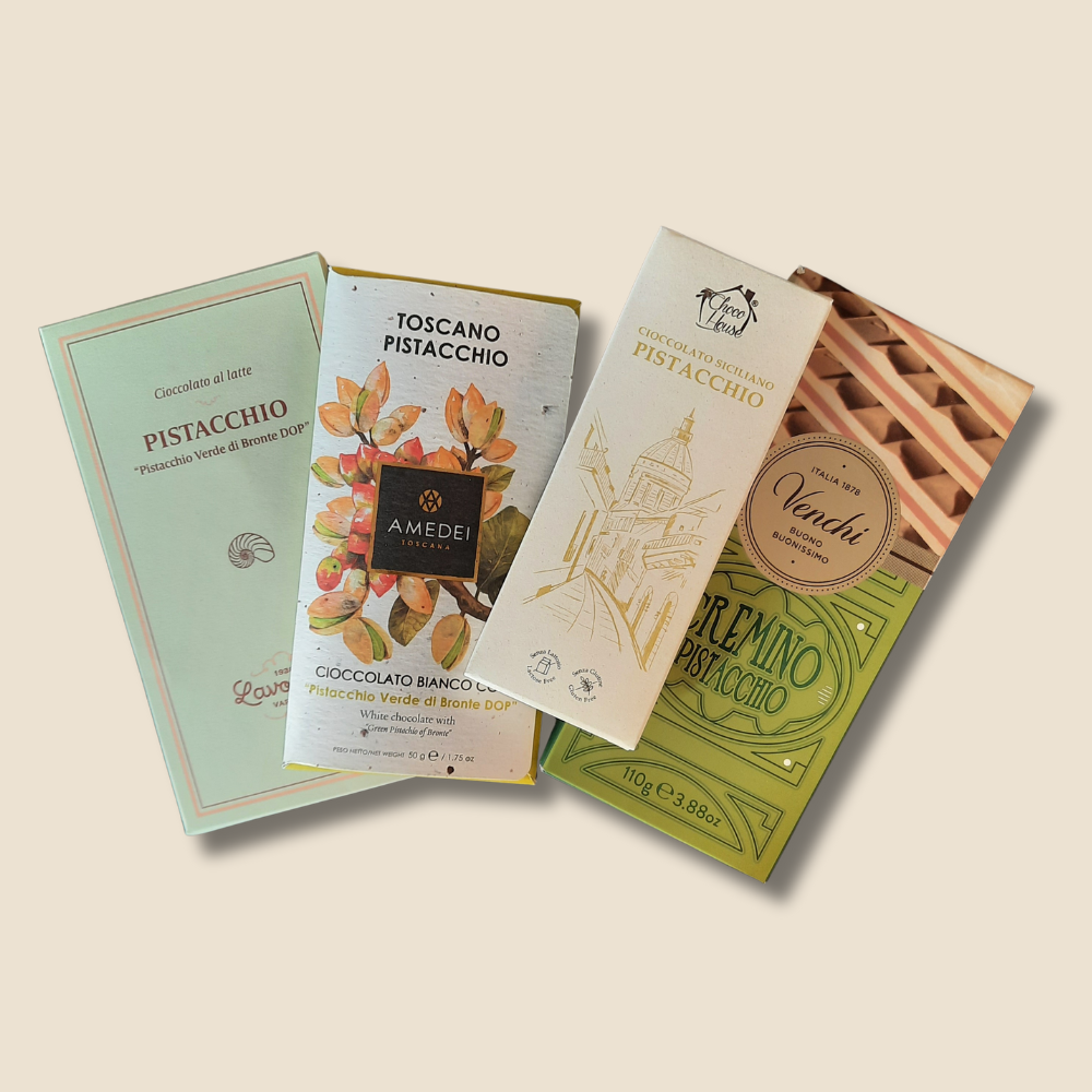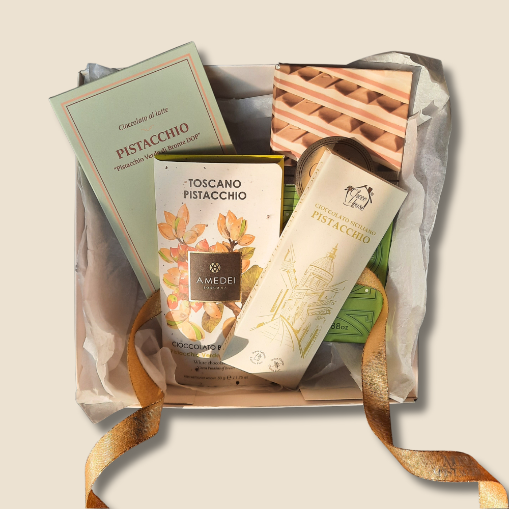 Il Pistacchio di Bronte è conosciuto nel mondo come “l’oro verde di Sicilia” – un tesoro dal gusto intenso e dal profumo inconfondibile. Questo kit esclusivo raccoglie quattro tavolette di cioccolato artigianale, tutte dedicate al rinomato pistacchio DOP di Bronte, lavorato con maestria da produttori italiani selezionati.